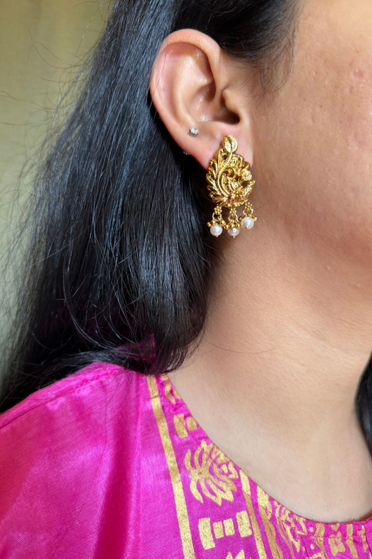 GOLDEN BIRD ROD EARRINGS- PINK PEARLS