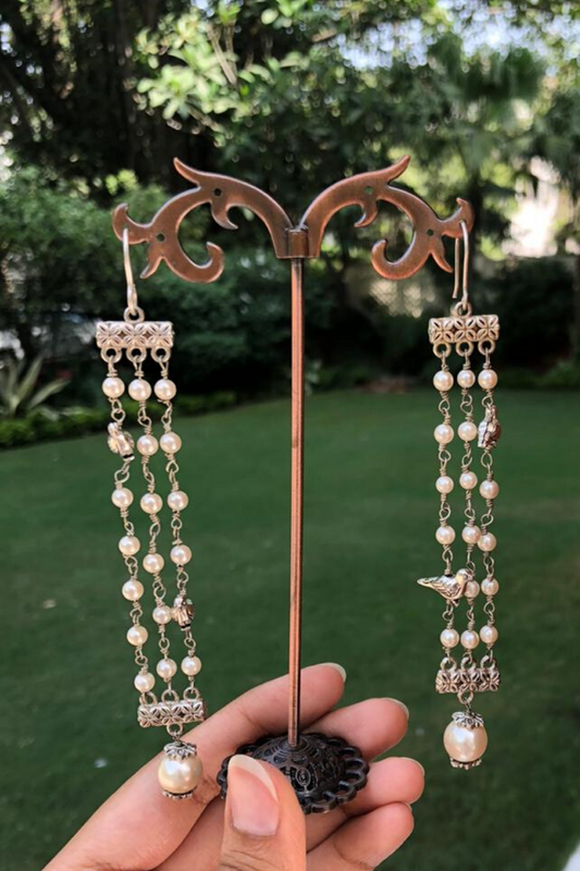 THREE LINE BIRD EARRINGS- PEARL DROP