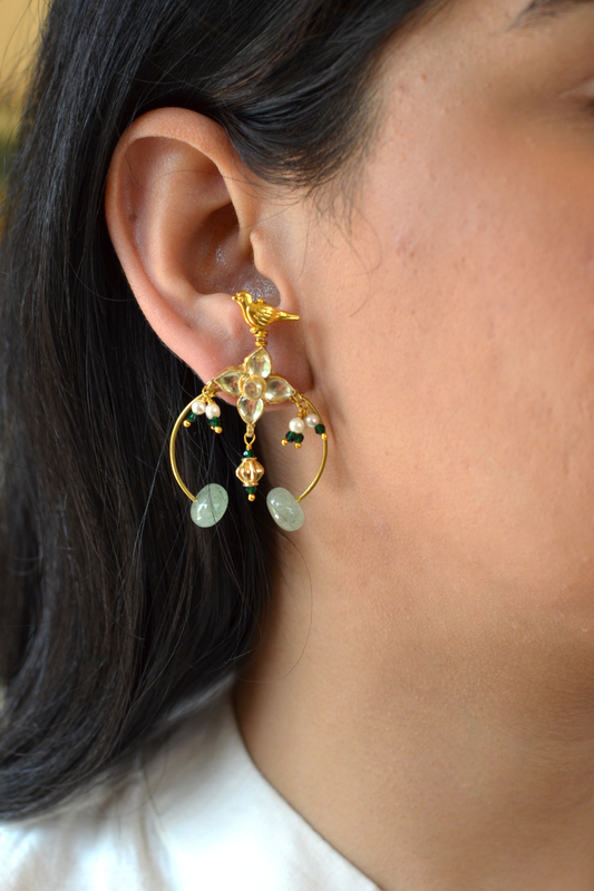 STONE STUDDED POLKI BIRD HOOPS- SAGE GREEN