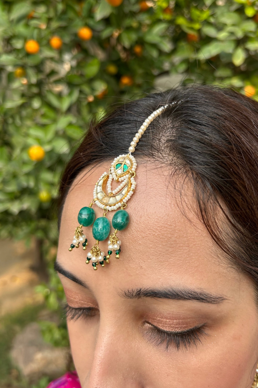 BRIDAL TRADITIONAL VERSATILE MATHAPATTI-CUM-NECKLACE - GREEN (Detachable dori lock and hair parting chain)