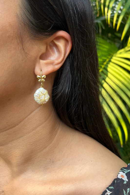 TWISTED GOLD-WRAPPED BUTTERFLY BAROQUE EARRINGS