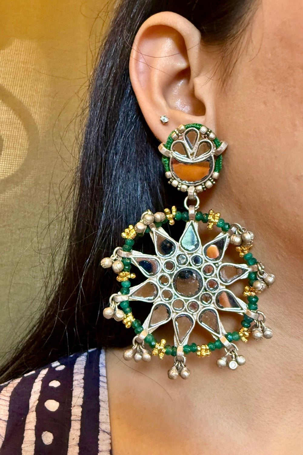 Made with intricate mirror work in rangoli-inspired patterns, complete with jingling ghungaroos to make a sweet sound, these earrings are all you need to make a statement!