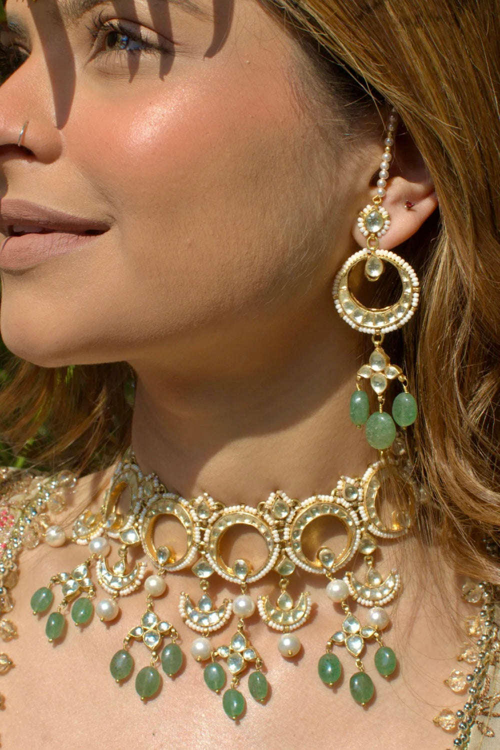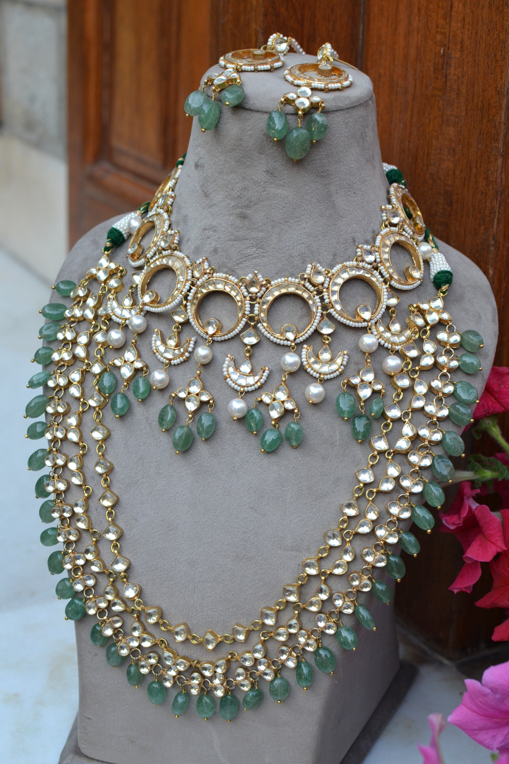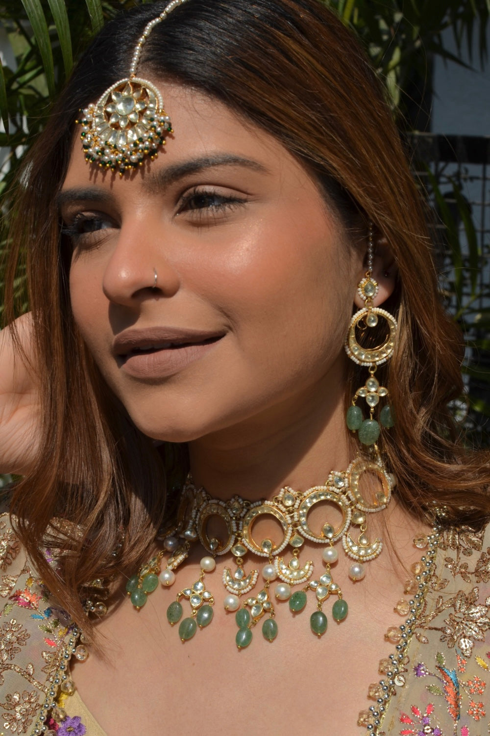 We use materials like shell pearls, copper alloy/brass metal, chains, natural and lab treated stones, carved and textured stones, beads, carved silver and gold look elements, polkis, etc.