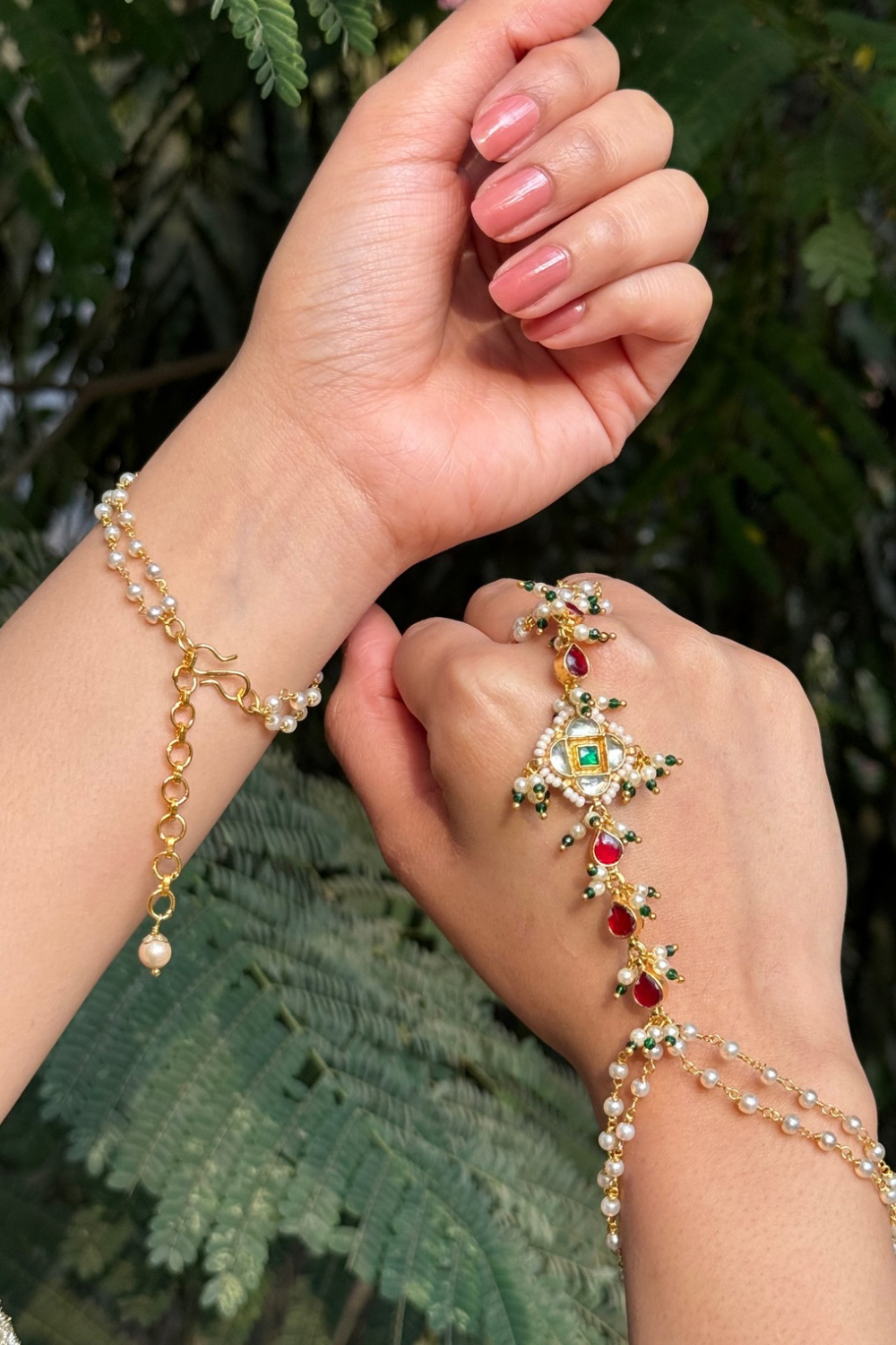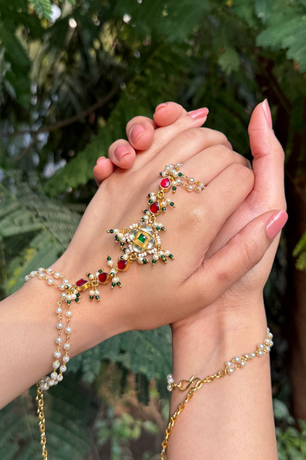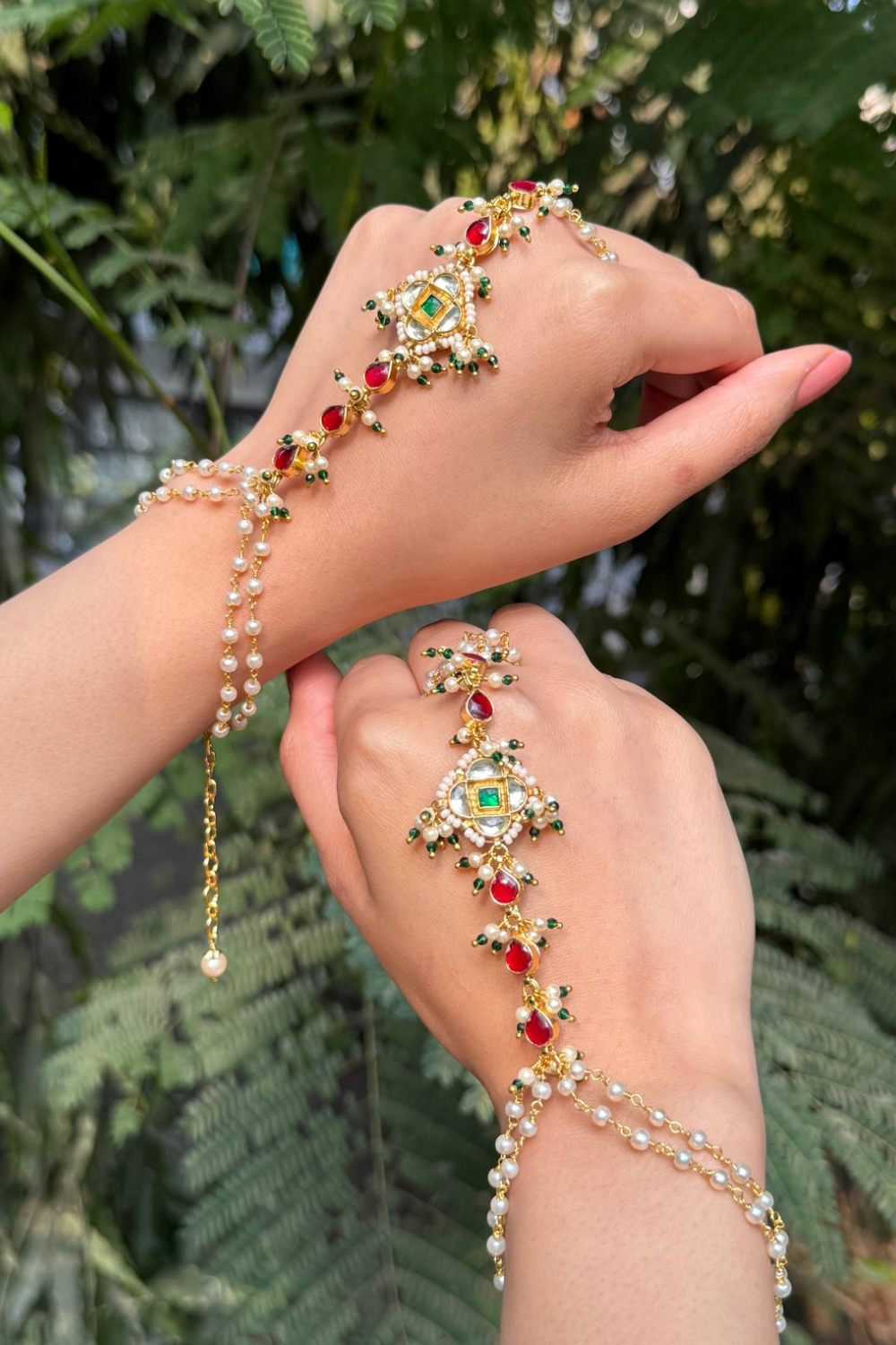 We use materials like shell pearls, copper alloy/brass metal, chains, natural and lab treated stones, carved and textured stones, beads, carved silver and gold look elements, polkis, etc.